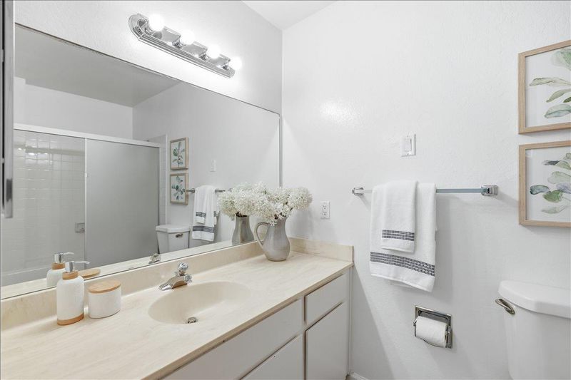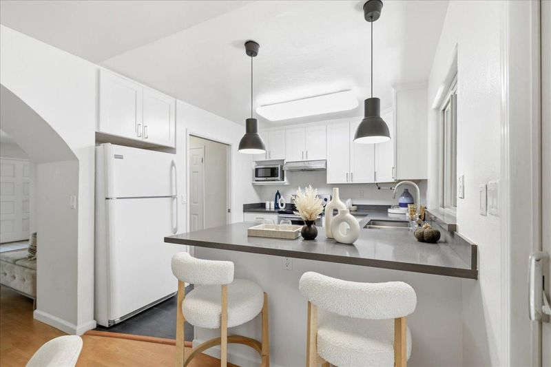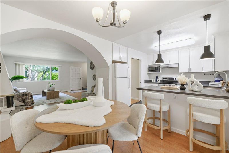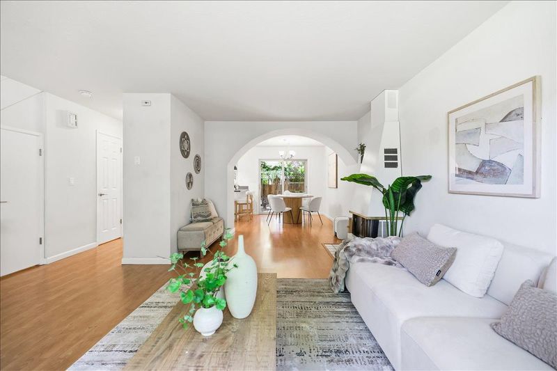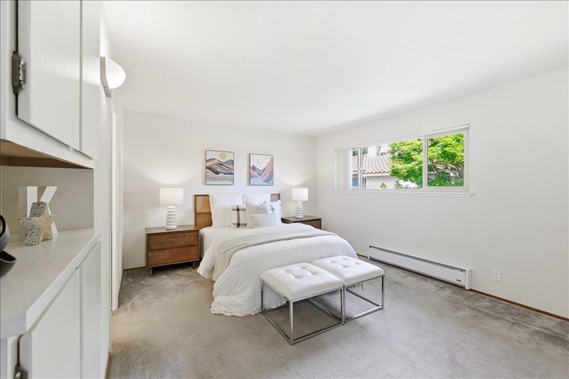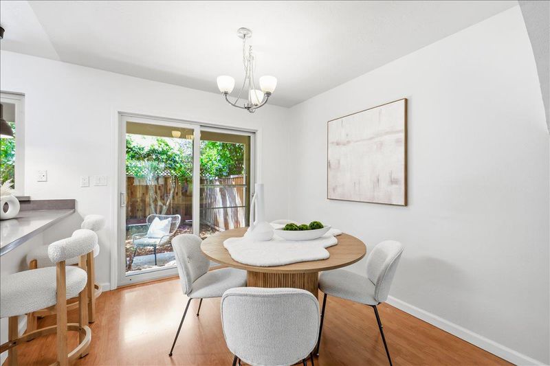 Bright and spacious townhome in the heart of Mountain View with top rated Los Altos High School, offering a functional layout and modern updates throughout. The main level features an oversized living room with a large picture window and cozy fireplace. The updated kitchen includes quartz countertops, designer cabinetry, newer stainless steel appliances, tile flooring, and a range hood vented to the exterior. A window over the sink overlooks the private patio, while the adjacent dining area opens directly to the outdoor space perfect for entertaining. The patio is surrounded by mature trees and flowering plants, creating a peaceful setting. Upstairs offers two spacious and bright bedroom suites, each with shower-over-tub bathrooms. A convenient laundry area with washer and dryer is also located on the second level. Additional features include double-pane windows and two assigned parking spaces. Ideally located near major tech companies including Google, Meta, Intuit, LinkedIn, and Apple, and close to Rengstorff Park, Community Center, Movie Theatres, San Antonio Village, downtown Mountain View, and Hwy 101.