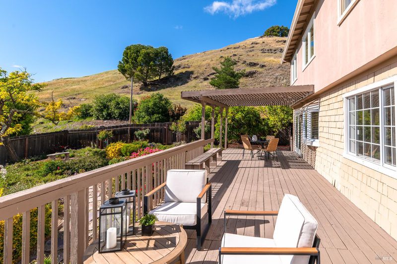 Situated on a cul de sac next to miles of open space, this remodeled home offers a perfect blend of comfort and style and ideal indoor-outdoor living. Boasting sweeping views that stretch across the valley to green hillsides, this property is a tranquil retreat ideal for those who appreciate both natural beauty and sophisticated living. The gorgeous modern kitchen includes sleek custom cabinetry, a massive center island, high-end stainless steel appliances, and elegant quartz countertops. Off the kitchen is a breakfast area with french doors opening to the backyard. Adjacent to the kitchen is a cozy family room with lovely built in shelving and a bay window. The light filled living room, with wood burning fireplace, opens to the expansive back deck. The formal dining room with a contemporary chandelier provides the perfect setting for hosting parties or family dinners. Upstairs are all 4 bedrooms, each with views. and 3 full baths. The primary suite has a bay window with a built-in bench seat, and an attached office that is the size of a bedroom. The primary walk-in closet is spacious with a central dressing island and a sun-splashed skylight. All the upstairs bathrooms are spa like with gorgeous custom cabinetry, beautiful shower stone walls and glass enclosures, and classic tile floors (2 of 3 heated). Throughout the home you will find custom details like slate-blue family room built-ins, plantation shutters and wide plank floors, creating an elevated feel. Air conditioning, updated electrical box and EV charger are welcomed additionals as well. The backyard is an outdoor oasis of level land, garden paths and elevated vistas. It is beautifully landscaped with vibrant flowers, fruit trees and hummingbirds. It is a bird watchers and gardeners paradise. Evenings are spent dining under the pergola, or relaxing on the extensive deck and enjoying magical sunsets over the Western hills Step out the front door and onto miles of pristine hiking and biking trails, offering instant access to Marin's trailheads and pristine nature. While you feel worlds away, you remain just minutes from local shopping, dining, and easy commute routes to SF, East Bay and all Marin has to offer. Located within the top-rated Dixie school district. Experience the rare combination of remodeled elegance, scenic serenity, and unrivaled outdoor access. This is more than just a home; live the Marin lifestyle.