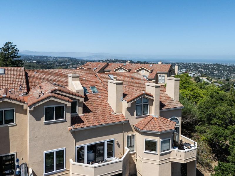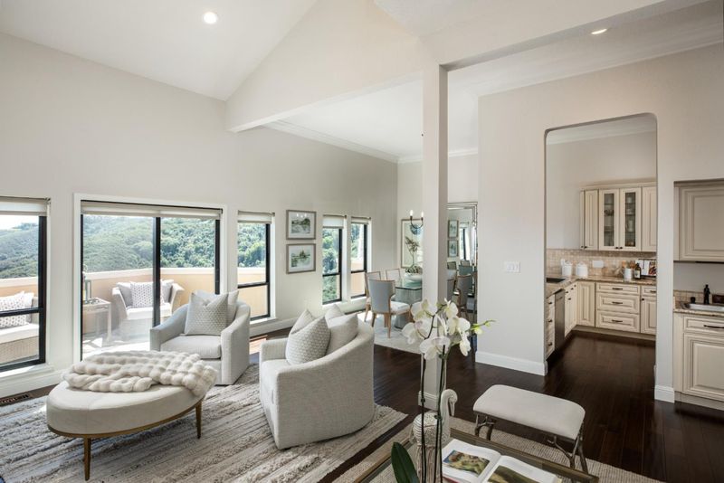 Tucked at the end of a quiet cul-de-sac in the hills of San Carlos, this Mediterranean-style home offers the kind of setting that's hard to come by sweeping panoramic views of the bay and canyon, dramatic ceilings, and beautifully finished interiors that are equally suited for relaxed everyday living and effortless entertaining. Private gated entry leads to a covered front door and welcoming foyer. Vaulted living room with skylights, stacked stone fireplace, wet bar with wine fridge, and multiple seating areas opens to a view balcony with sweeping bay & canyon vistas. Chefs kitchen features granite counters, mosaic backsplash, stainless appliances including a 5-burner gas range & double ovens, adjacent to a view-filled dining area. Luxurious primary suite with vaulted ceilings, skylight, fireplace, built-ins, dual closets, and designer lighting; spa-like bath with jetted tub, dual vanity, and scenic views. Secondary bedrooms offer walk-in closets, custom cabinetry, and private balcony access. Additional amenities: laundry room, 2 car garage, AC, hardwood floors, new carpet, recessed lighting, crown molding, electronic shades, & Nest thermostat. HOA amenities include pool, spa, tennis courts, & play area. Conveniently located near hiking trails, Hwy 280 & outstanding schools.